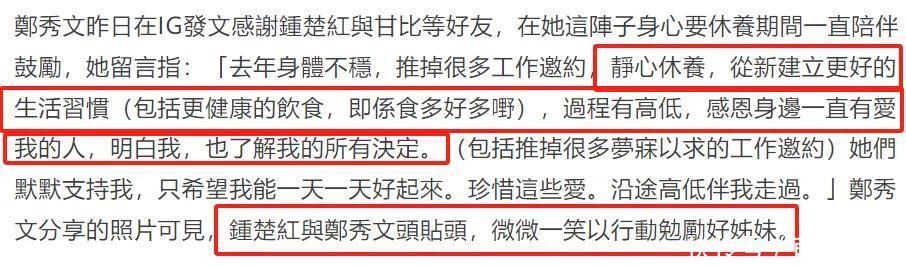 不仅如斯,钟楚红还匡助好友郑秀文走出抑郁,靠的亦然一句:“静心疗养,重新建树细密的生计习尚”。