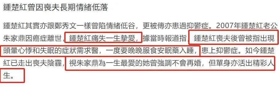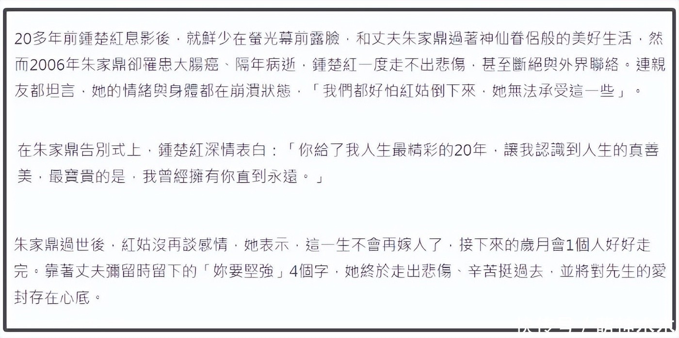2007年,与钟楚红相伴16年的丈夫朱家鼎因大肠癌升天,钟楚红在丈夫告别庆典上默示这一世不会重婚东说念主了,如今17年曩昔,钟楚红与丈夫离别的本领一经比他们相伴本领更长了,她依旧效能着答允。